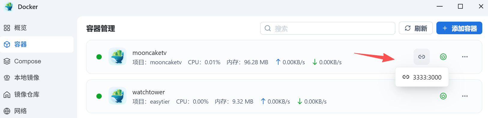 Docker管理页面,在容器菜单,就可以看到运行情况,点击mooncaketv右侧🔗可以直接打开