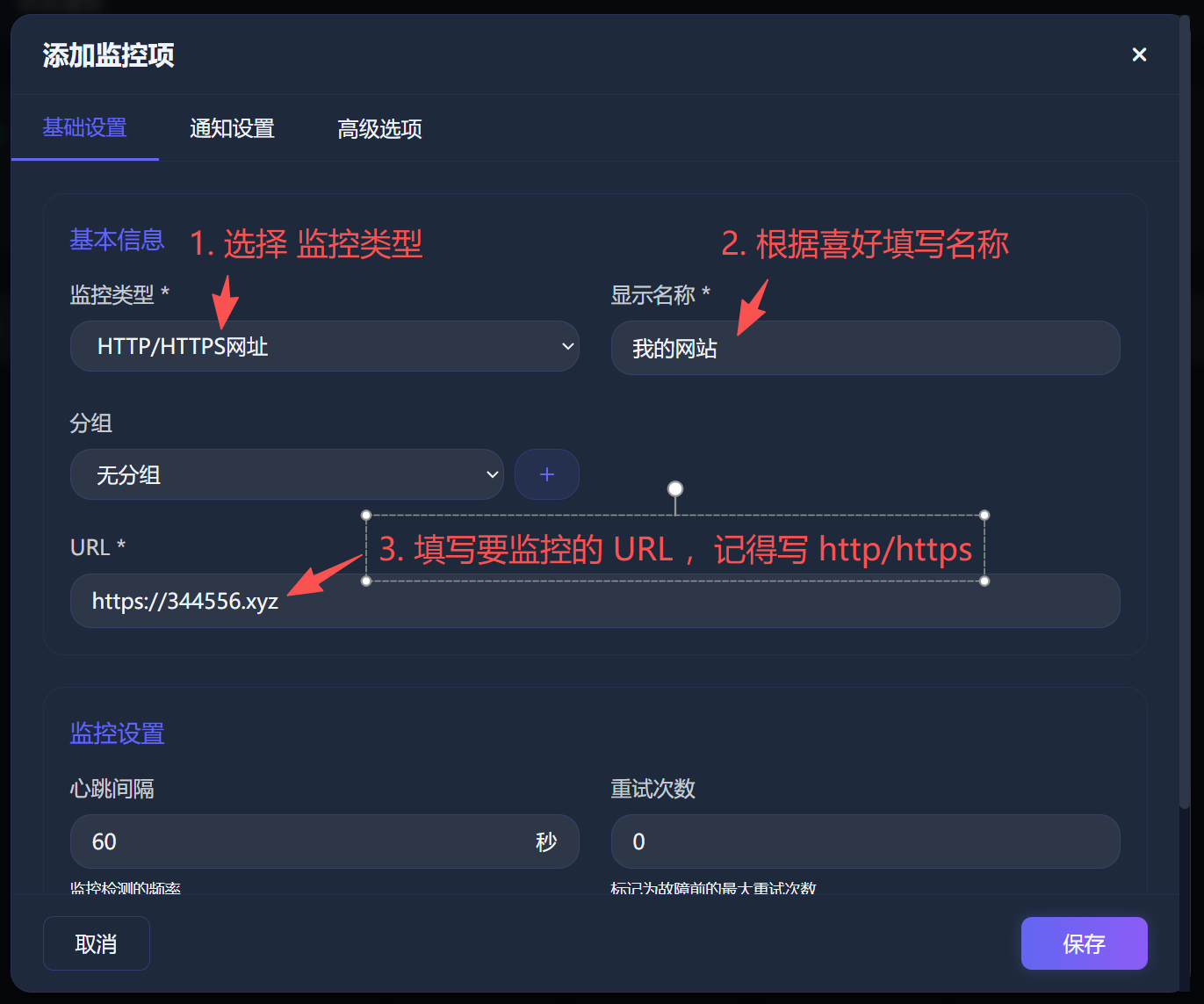 - 🧭 多种监控类型:支持 HTTP/HTTPS 网站、API 接口、HTTPS 证书过期、TCP 端口、MySQL/Redis 数据库等多种监控