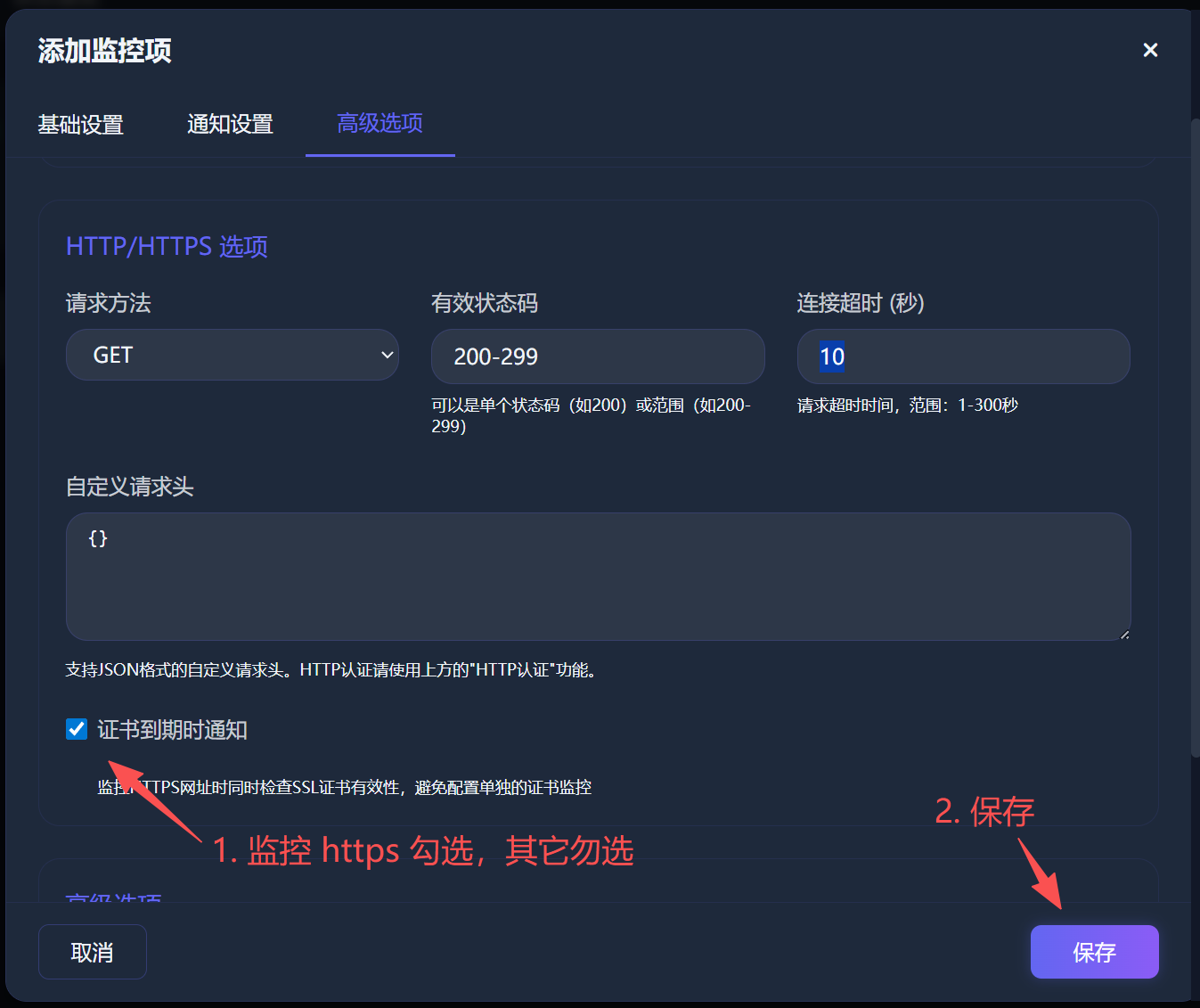 - 🔒 HTTPS 证书监控:检测 SSL 证书的过期时间,提前预警,避免访问异常