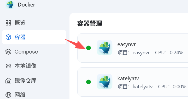 Docker管理页面,在容器菜单,就可以看到运行情况。