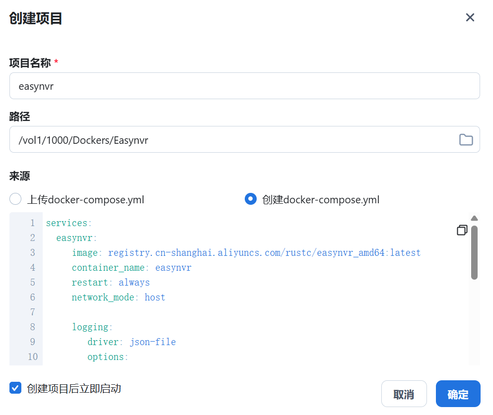 项目名称、选择路径,并把上面docker-compose.yml文件内容复制填入来源文本框内容。按需修改检查无误后点击确定按钮进行部署。