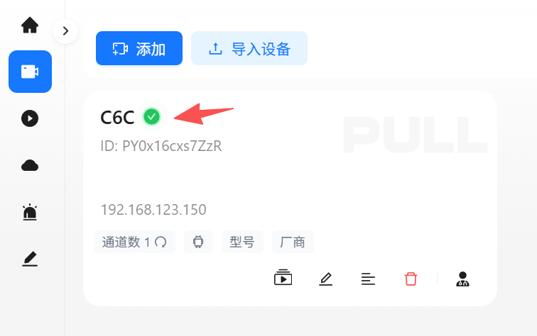 萤石C6系列摄像头的拉流地址格式如下:rtsp://admin:密码@局域网IP:554/h265 设备列表页面等待一会,设备名称旁变为绿色√就说明添加成功。