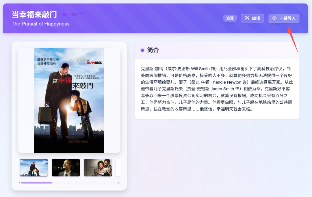 点击海报封面,打开海报内容以及简介,右边 一键导入 的选项,点击之后会显示资源已成功导入