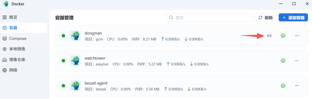 3. 在容器菜单可以看到运行情况,点击右侧链接即可打开
