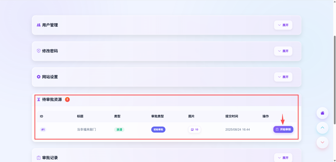 切换回后台,在待审核资源这里能看到刚刚提交的资源,点击开始审核。