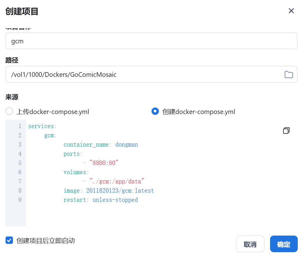 2. 创建项目页面把上面 docker-compose.yml 内容复制后点击确定进行部署