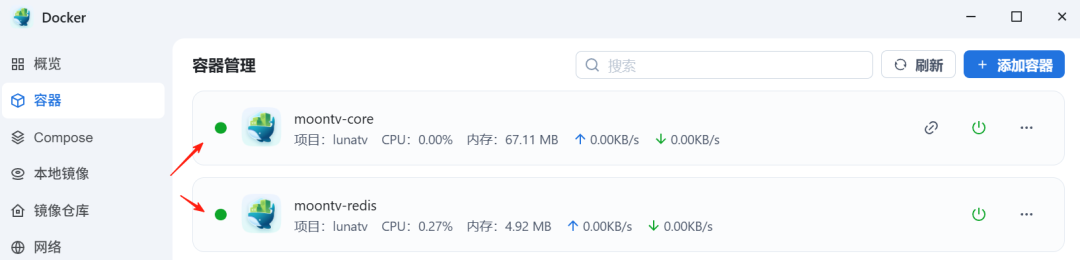 3. 返回 Docker管理页面,在 容器 菜单,就可以看到运行情况,点击 moontv-core 右侧🔗可以直接打开 LunaTV