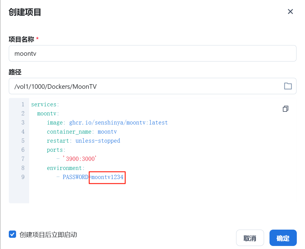 2. 创建项目页面根据实际情况定义 项目名称、选择 路径,并把上面 docker-compose.yml 文件内容复制填入 来源 文本框内容。检查无误后点击 确定 按钮进行部署。