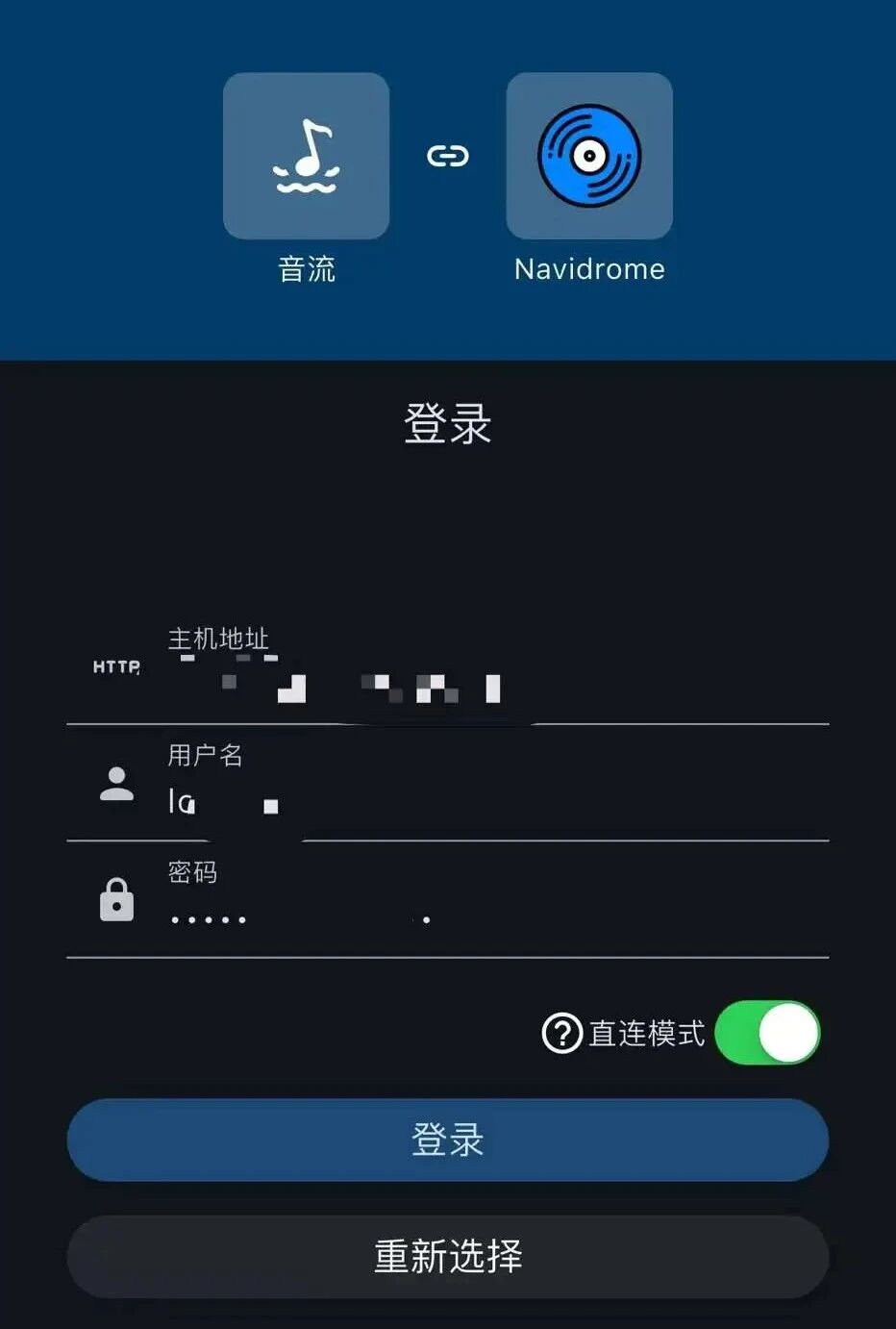 - 首次打开时,需要连接服务端。在 Navidrome 中复制主机地址,然后使用之前注册的管理员账号和密码登录,选择直联模式,即可进入客户端首页。