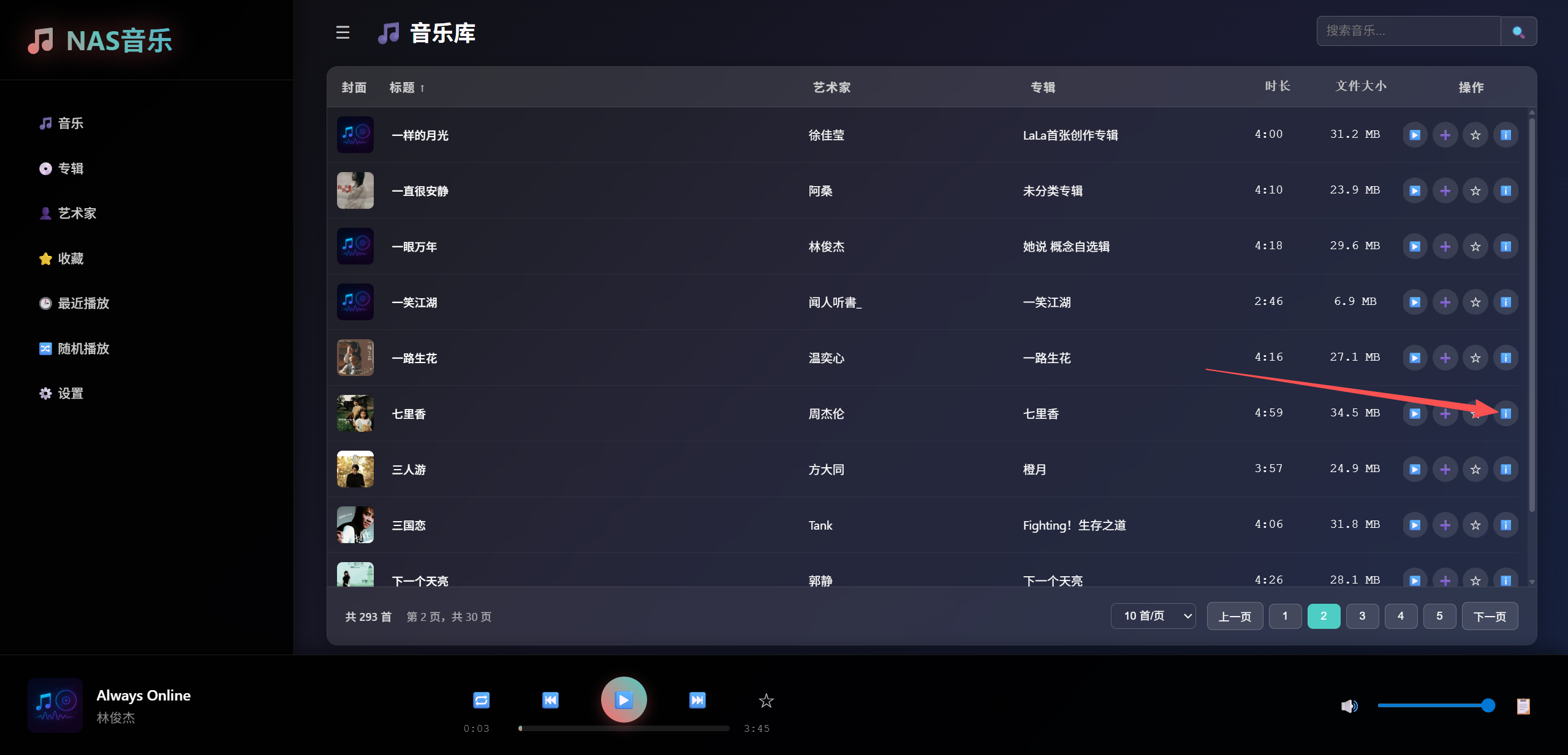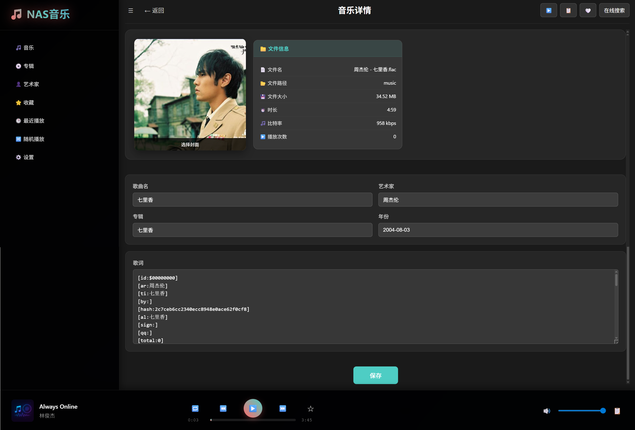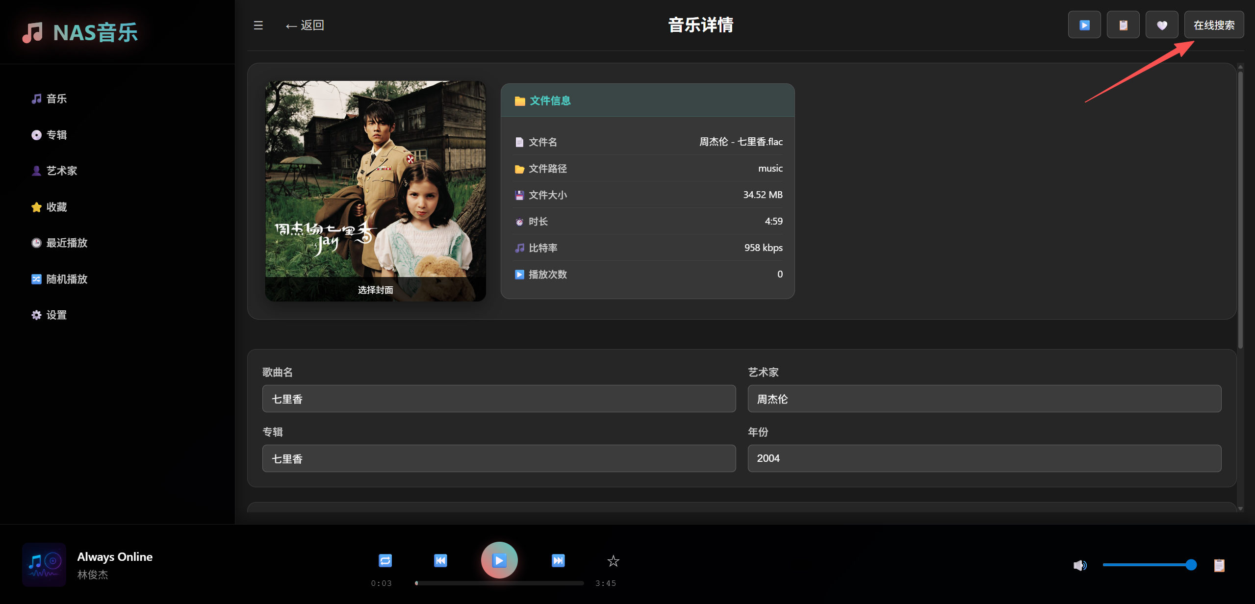 在数字音乐时代,拥有一个功能强大的本地音乐服务器,不仅能让你随时畅听心爱的曲目,还能实现数据同步、歌词封面自动获取等智能功能。今天就来介绍一款基于 Node.js 构建的开源项目 —— NAS 音乐服务器,它将本地音乐管理与在线搜索完美融合,轻松打造属于你的智能音乐中心。