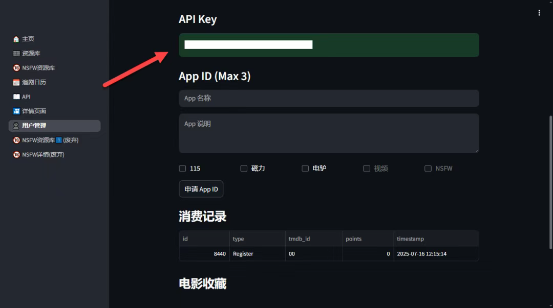 - 登录后在用户管理中获取专属 API Key,记得复制保存。