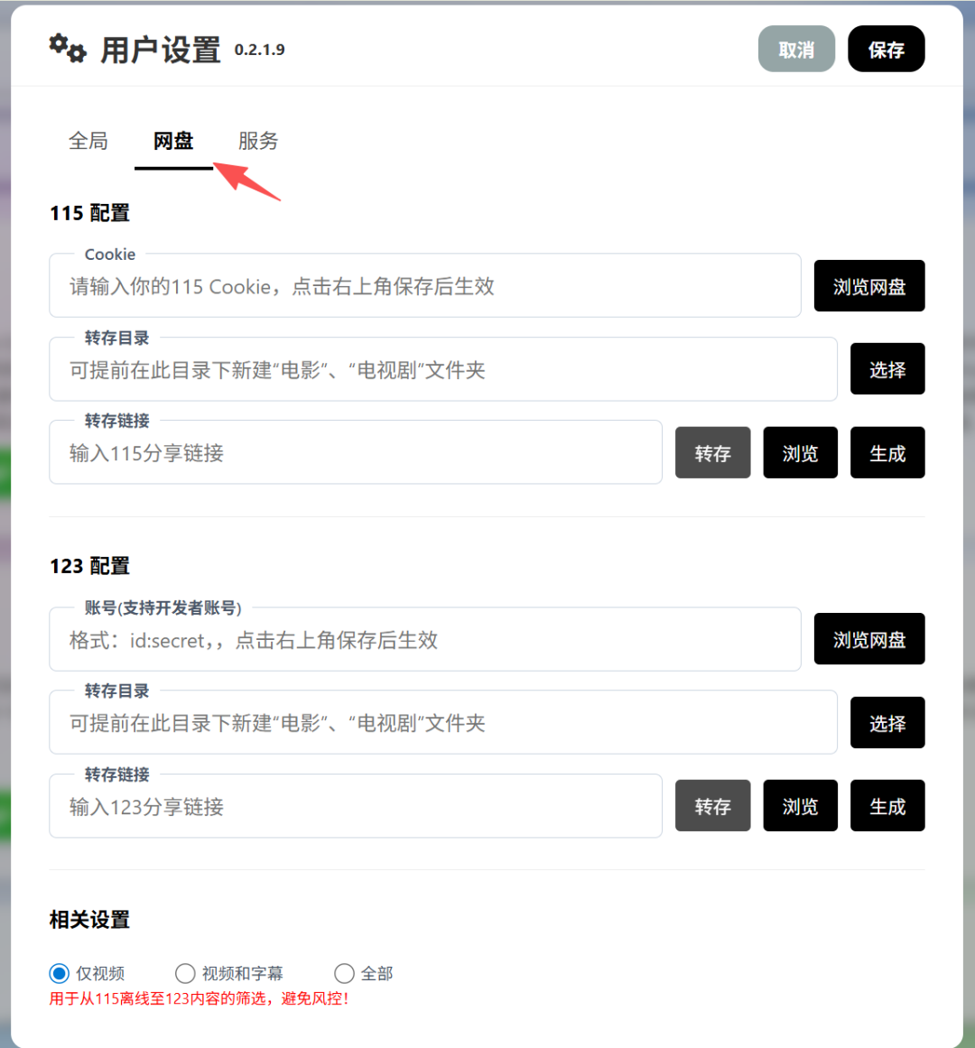 - 点击 网盘 选项卡,可以添加自己的 115网盘,123网盘。用来保存到对应网盘中。