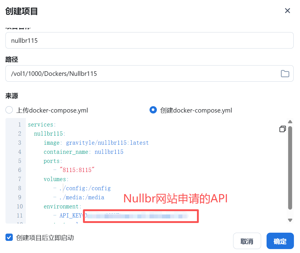 restart: always8115:冒号前面端口如果有部署其它服务,可以修改为未使用的端口。例如:5115:8115API_KEY: 改为上步申请的API