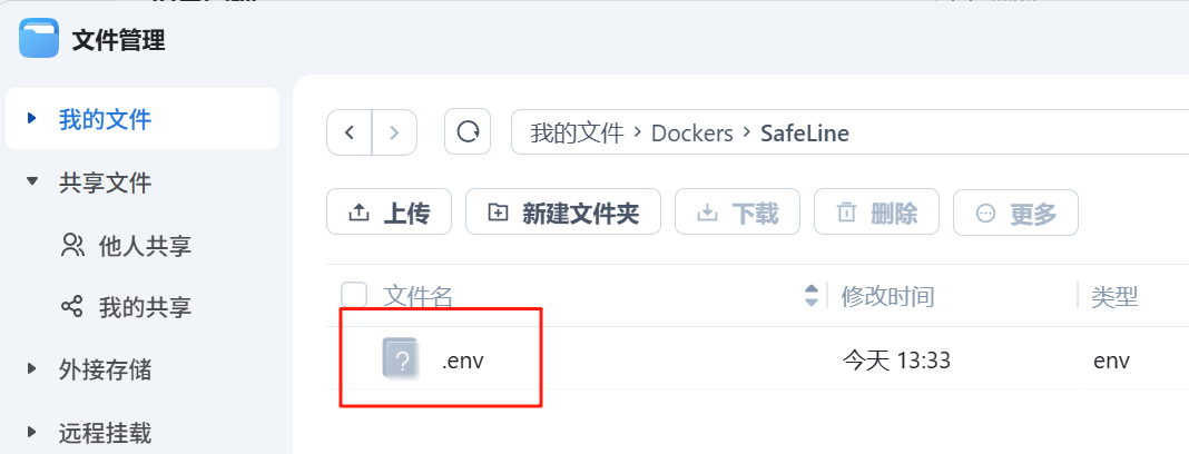#### 3. 在电脑里面新建文件 .env 并填入以下内容, 然后通过飞牛文件管理上传到 SafeLine 文件夹中。