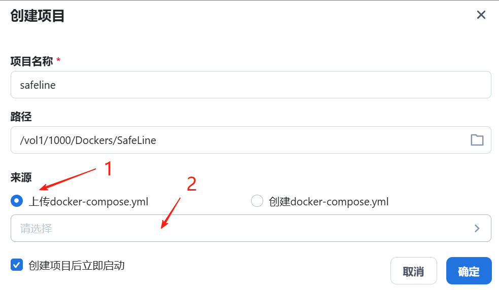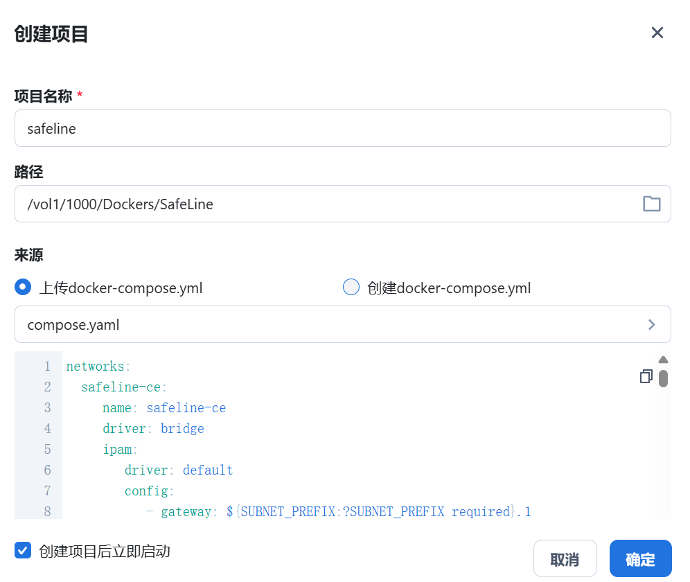 6. 创建项目页面根据实际情况定义 项目名称、选择 路径,选中 上传 docker-compose.yml 并点击选择框把 步骤 4 下载的 yaml 文件上传到 NAS中。检查无误后点击 确定 按钮进行部署。
