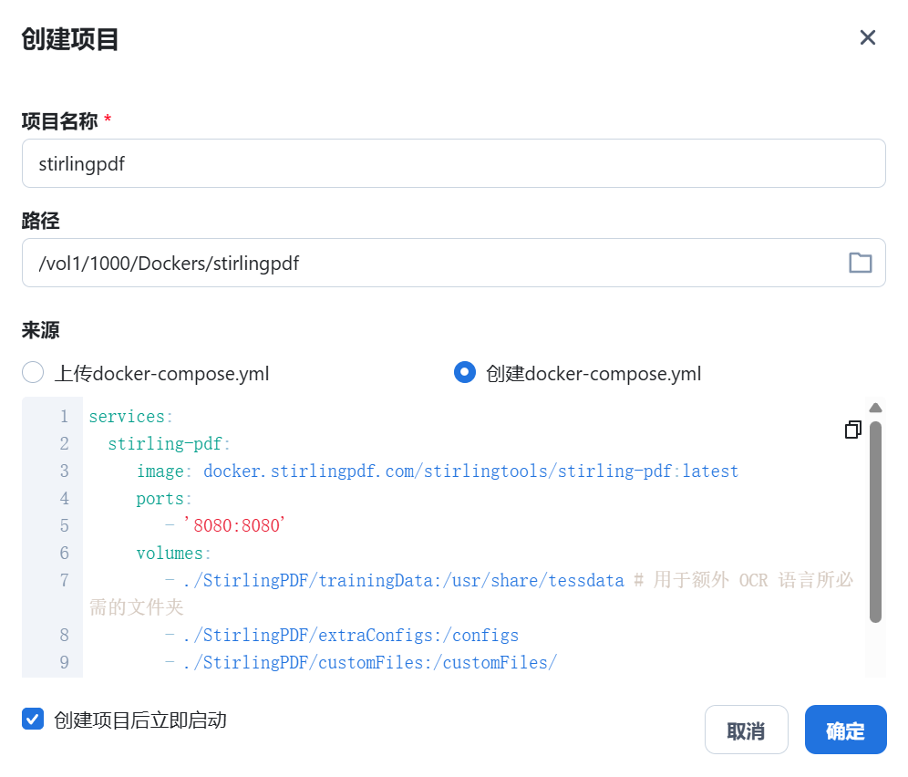 2. 创建项目页面根据实际情况定义 项目名称、选择 路径,选中 创建 docker-compose.yml 后,把下面 yml 文件粘贴到文本框中。检查无误后点击 确定 按钮进行部署。