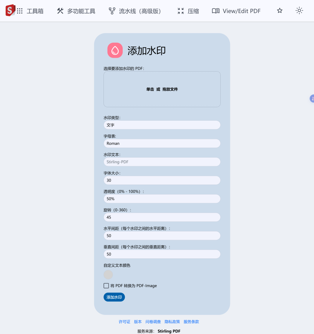 docker.stirlingpdf.com/stirlingtools/stirling-pdf:latestDocker Compose 部署