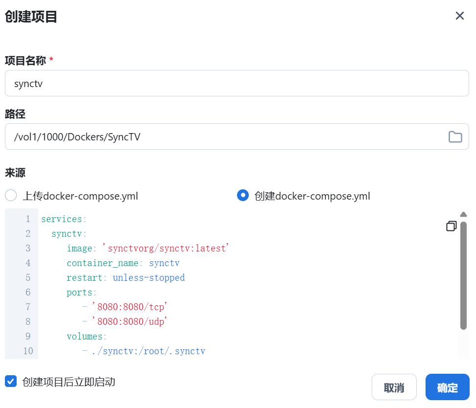 项目名称、选择路径,并把上面docker-compose.yml文件内容复制填入来源文本框内容。按需修改检查无误后点击确定按钮进行部署。