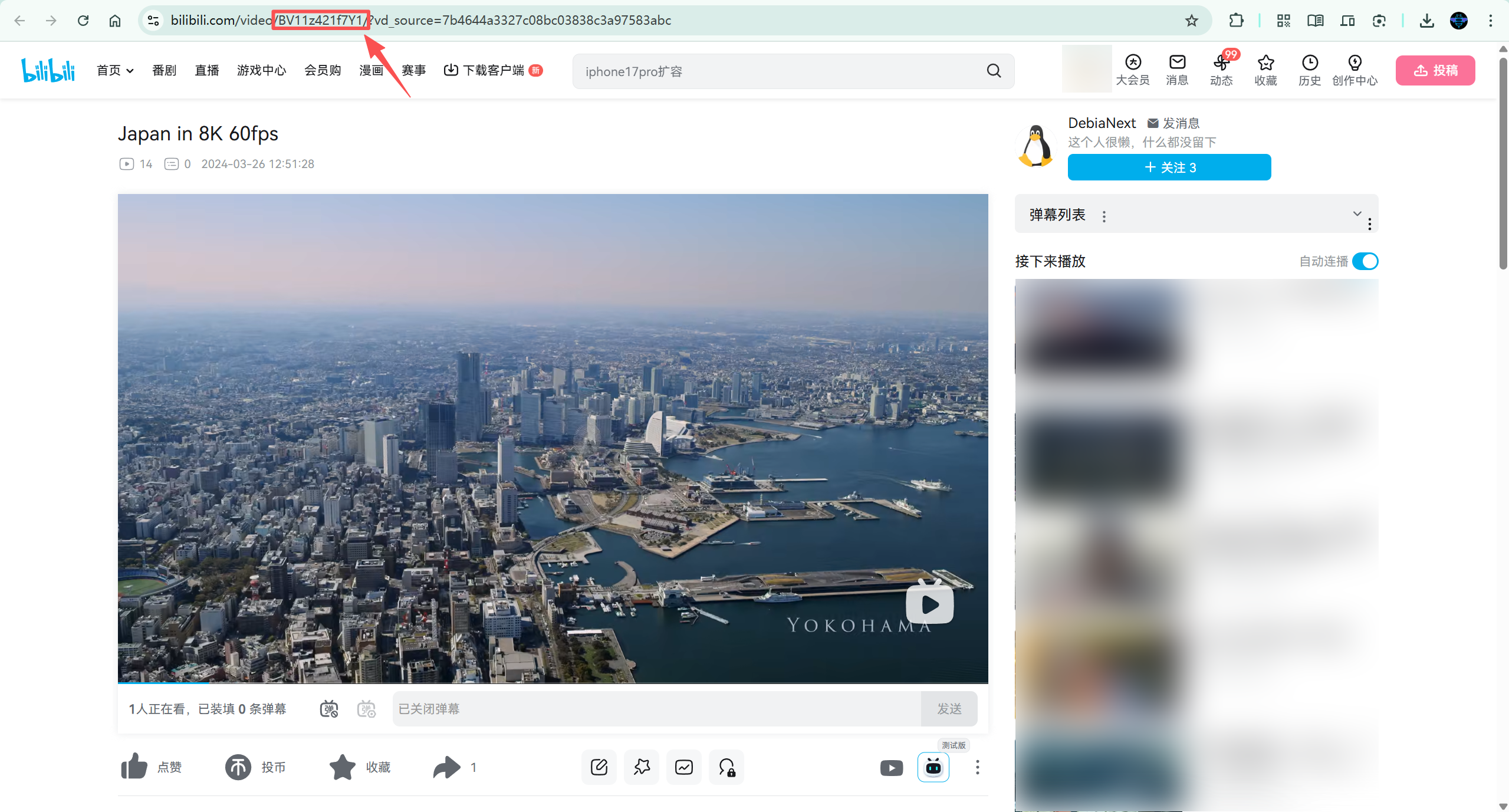 打开哔哩哔哩网站,复制视频URL 或 BV号,下面截图以 BV号 为例。