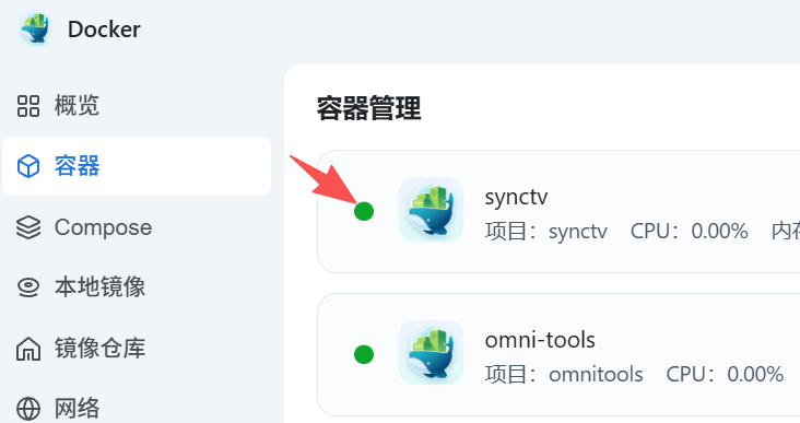 Docker管理页面,在容器菜单,就可以看到运行情况。点击右侧🔗可以直接打开。