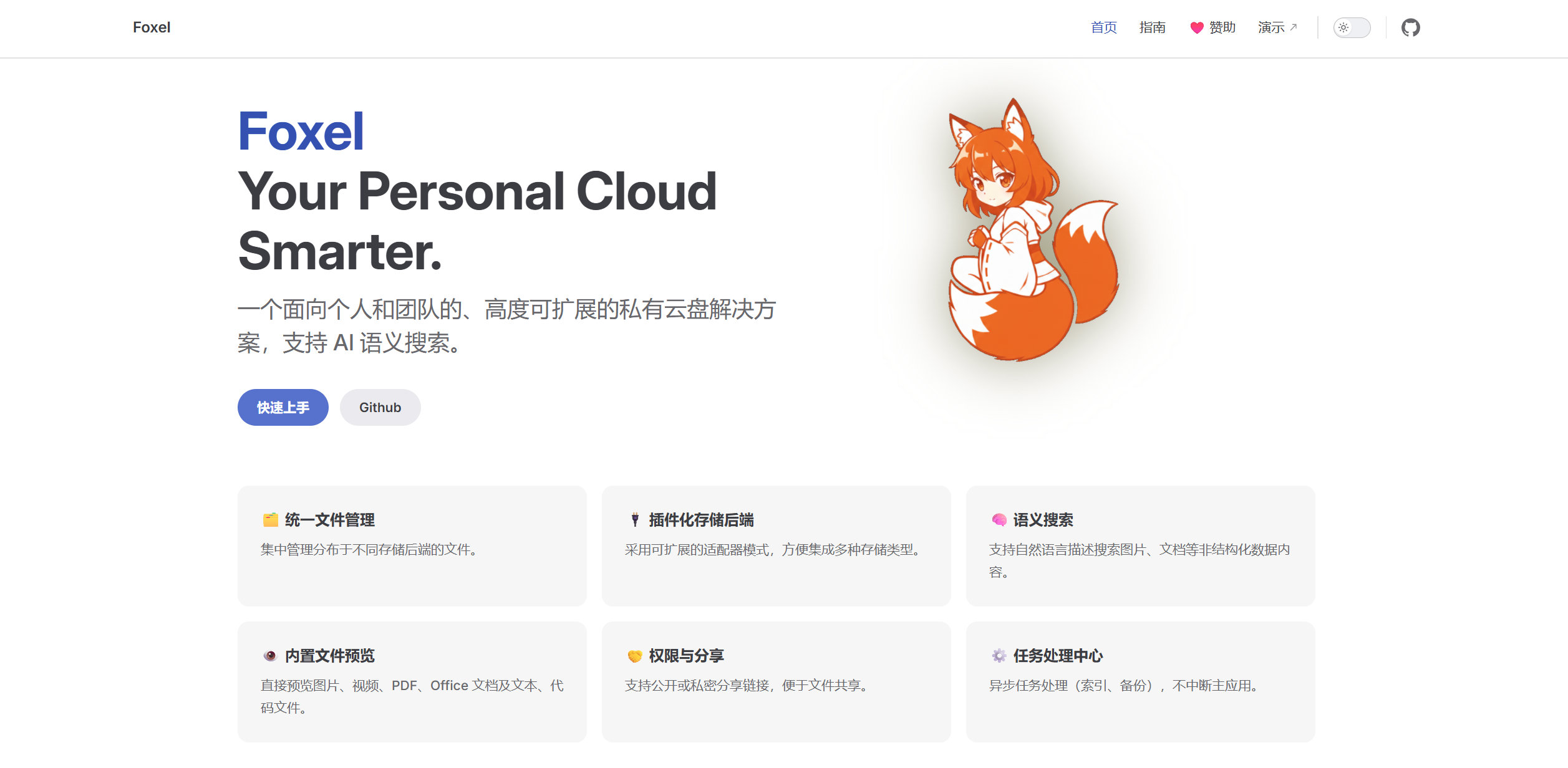 Foxel 是一款支持 AI 语义搜索的私有云盘解决方案,适用于个人与团队。统一管理文件、多端适配、在线预览与权限分享,部署简单,功能强大,助你高效掌控数据。