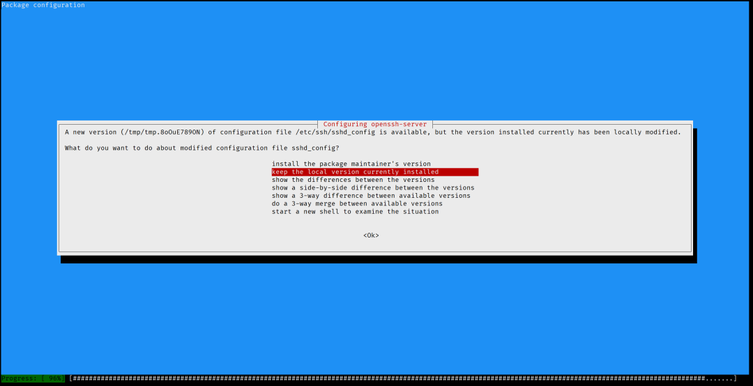 - 配置文件更新 → 默认回车表示保留旧配置(常见于