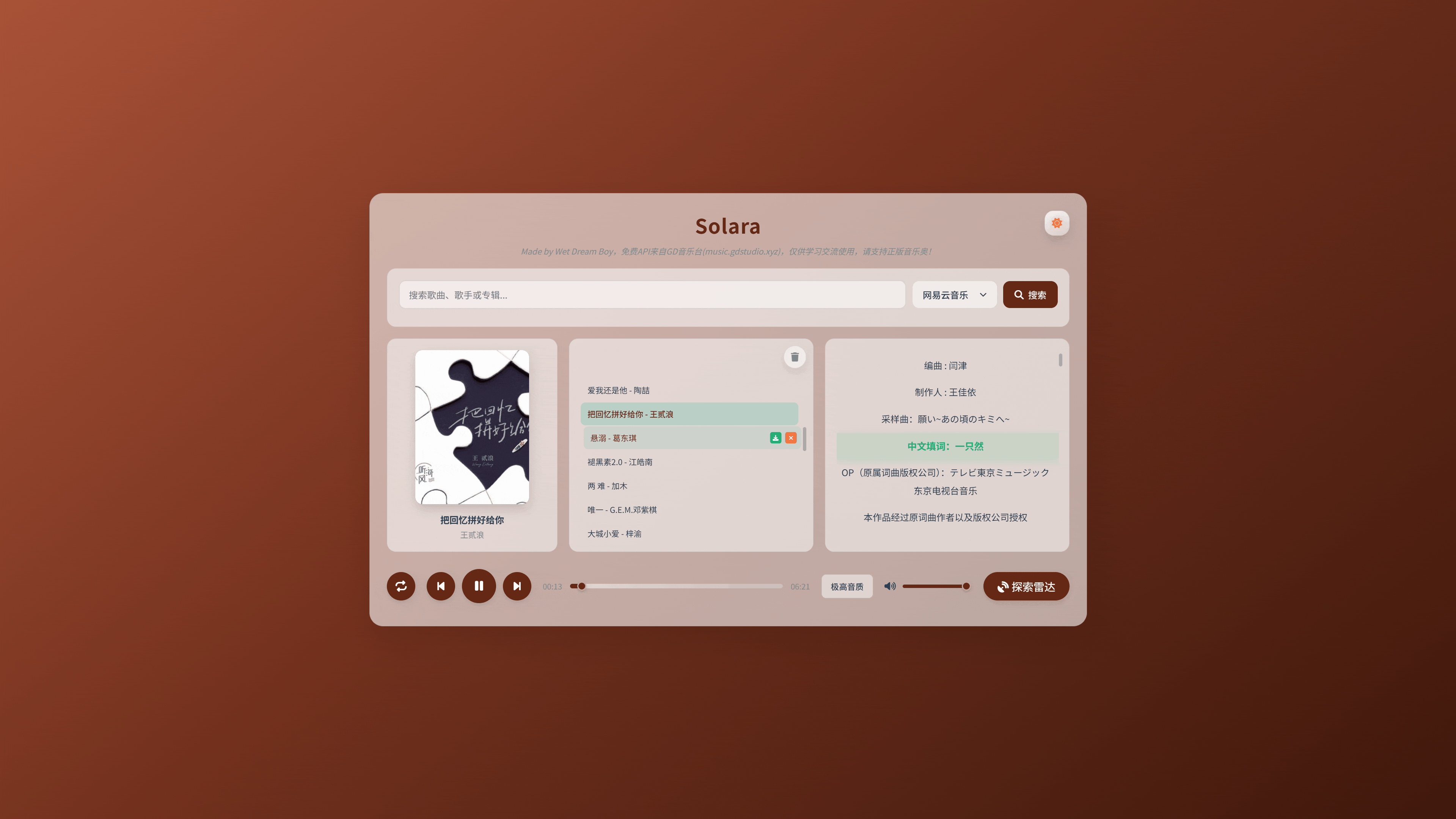 🎶Solara(光域) 是一个极简风格的基于免费API的音乐播放器。由轻量后端服务支撑的现代化网页音乐播放器,整合多种音乐聚合接口,覆盖搜索、播放与音频下载全流程。