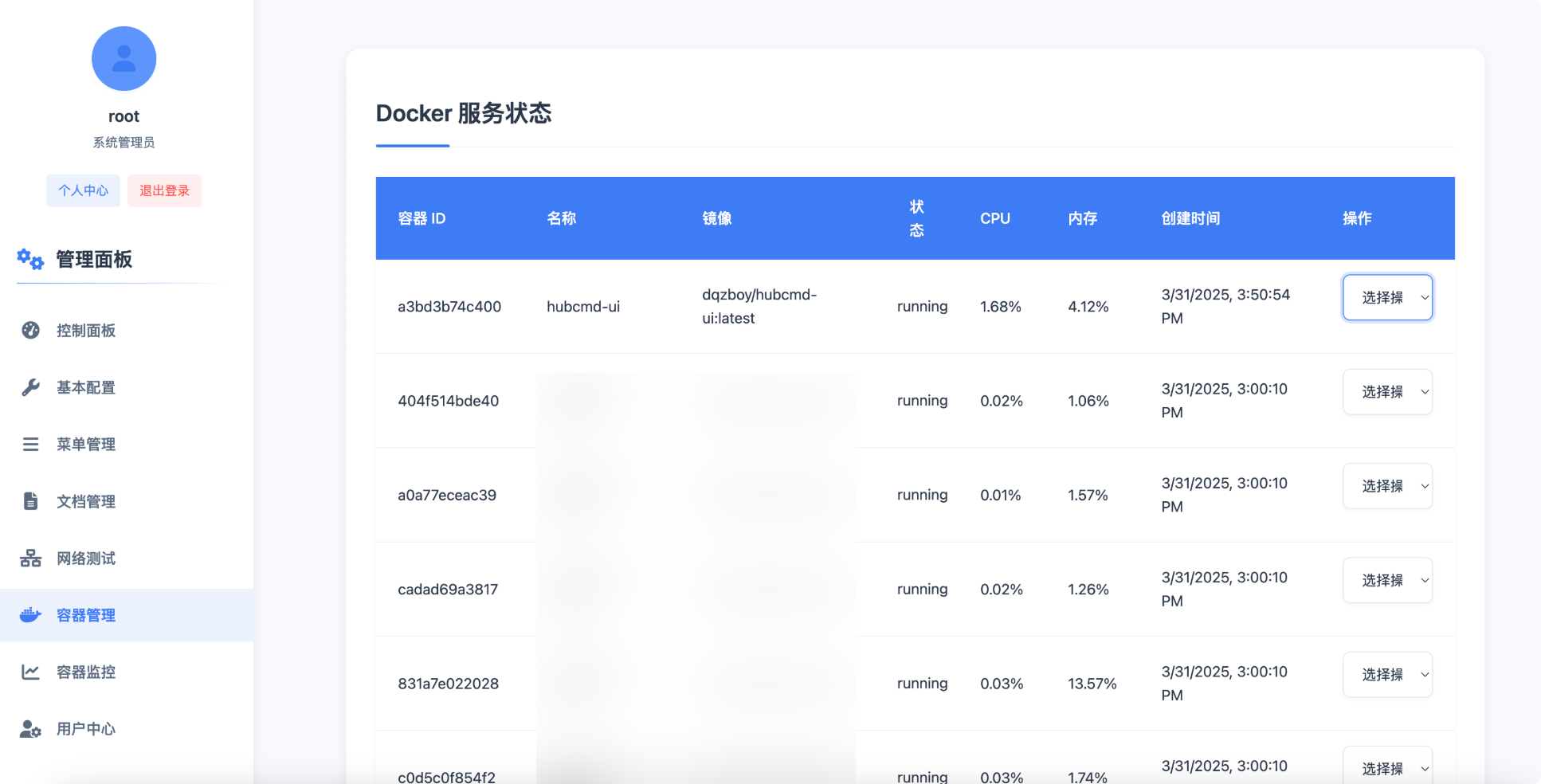 HubCMD-UI服务,面板展示、镜像搜索、文档教程、容器管理、容器监控、网络测试、用户中心等功能