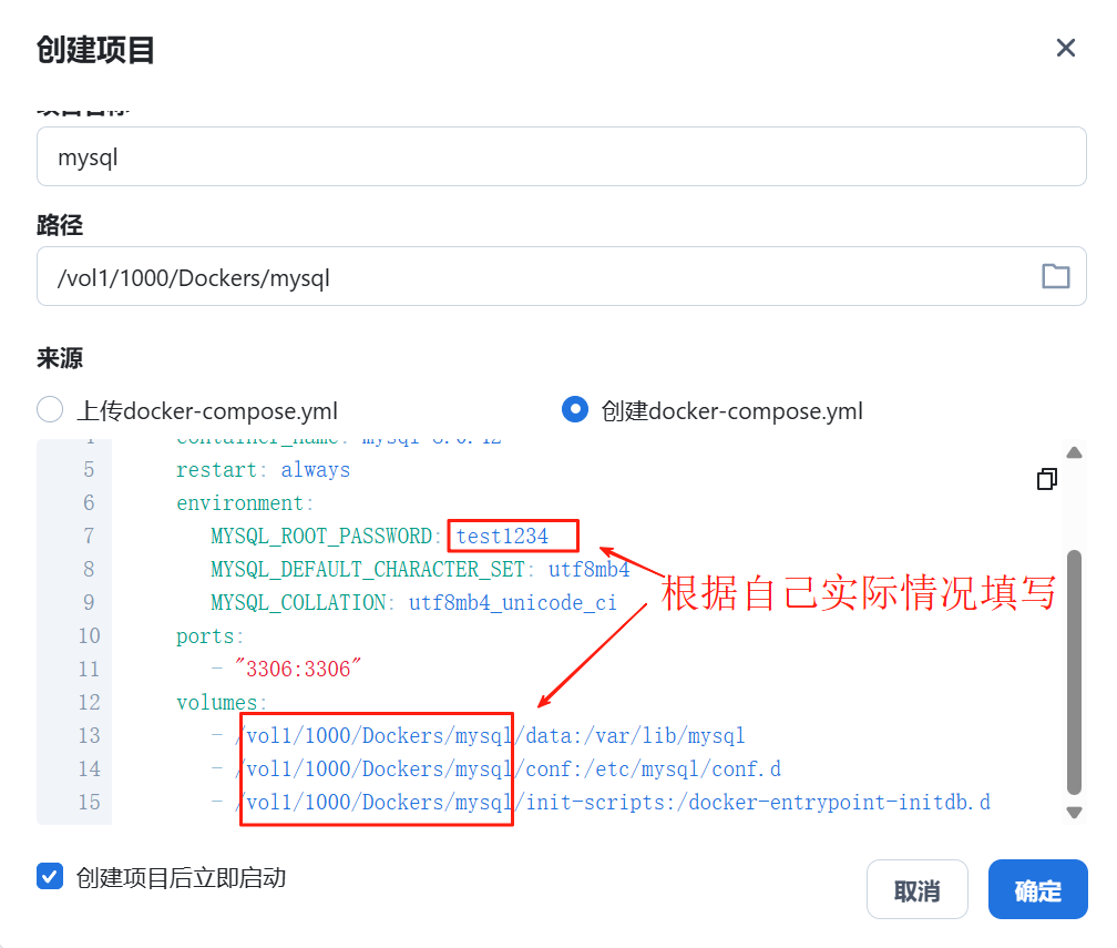 Docker切换到Compose->新增项目,填入下图内容。