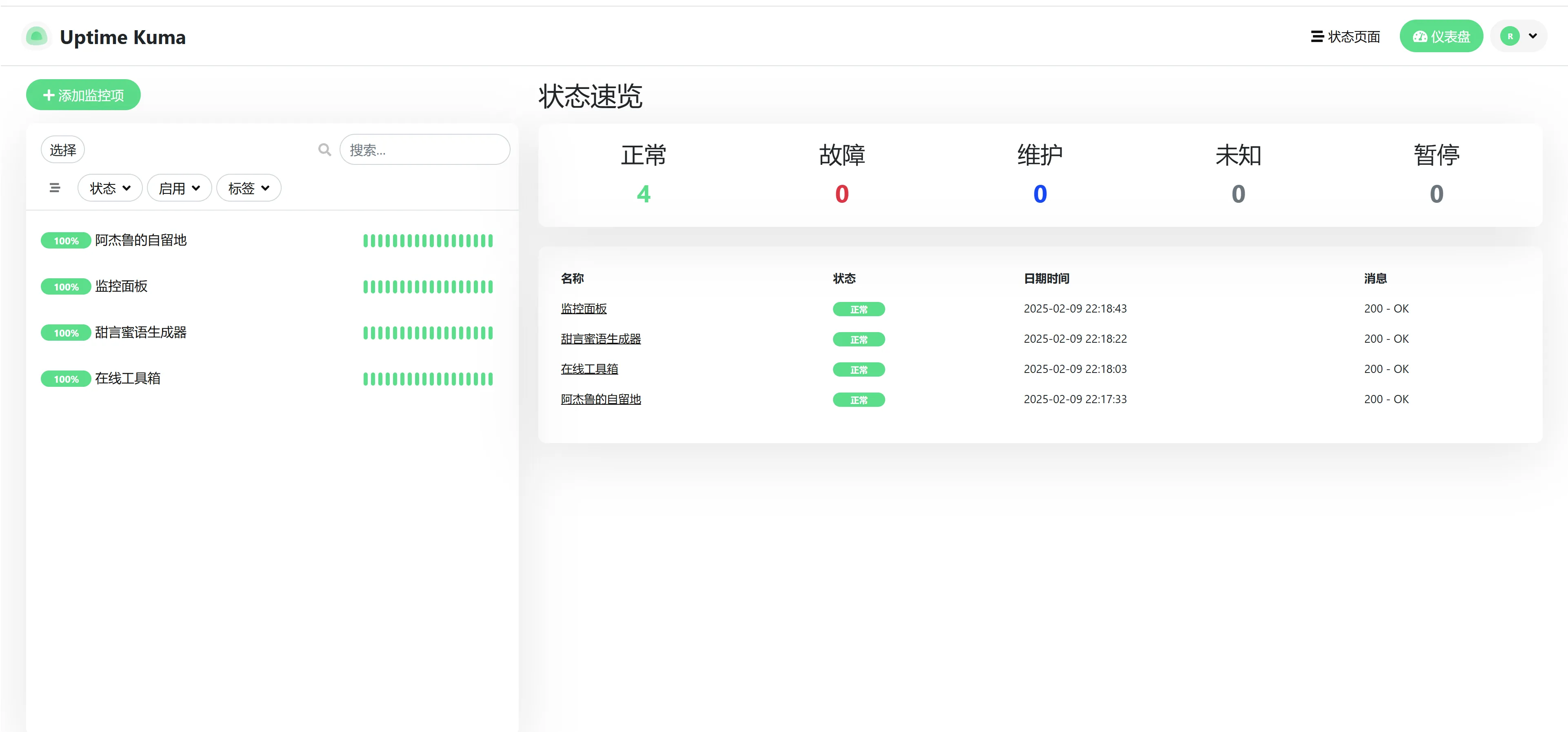 Uptime Kuma 仪表盘非常简洁,左边添加监控项,右边展示状态速览,没有多余的狗皮膏药,监控信息一目了然。